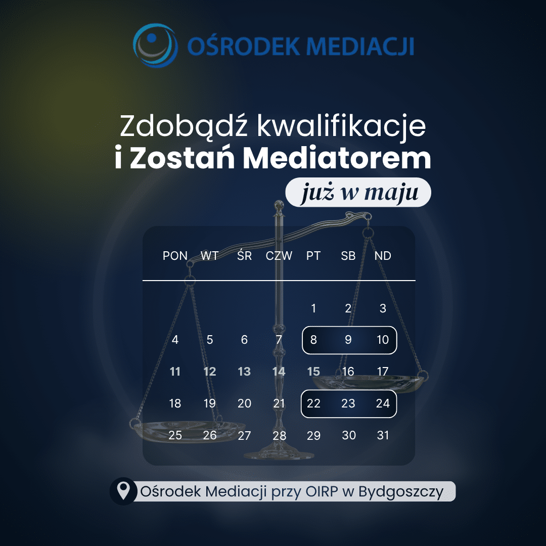 Ośrodek Mediacji przy Okręgowej Izbie Radców Prawnych w Bydgoszczy serdecznie zaprasza do udziału w szkoleniu „Zostań Mediatorem”, skierowanym do radców prawnych zainteresowanych zdobyciem i rozwijaniem kompetencji mediacyjnych.